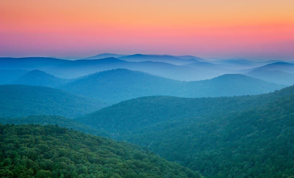 Our vision for cycling in Arkansas was expansive, and we knew that the trail system had the potential to change the entire narrative of the region and state. This was no small task for the design team to match such a lofty vision. We knew one thing to be true: we had to showcase in the brand the beauty of the land. The verdant forests and the color of the skies are special elements of the Ozarks, and we felt they had to be included in some aspect of the design. The natural world would be our inspiration! But how should we translate that to the brand? We came across a great photo by Arkansas photographer Paul Caldwell that captured the cotton candy pastel skies of a sunset over the rippling mountains. It was majestic. It was powerful. It was our home.