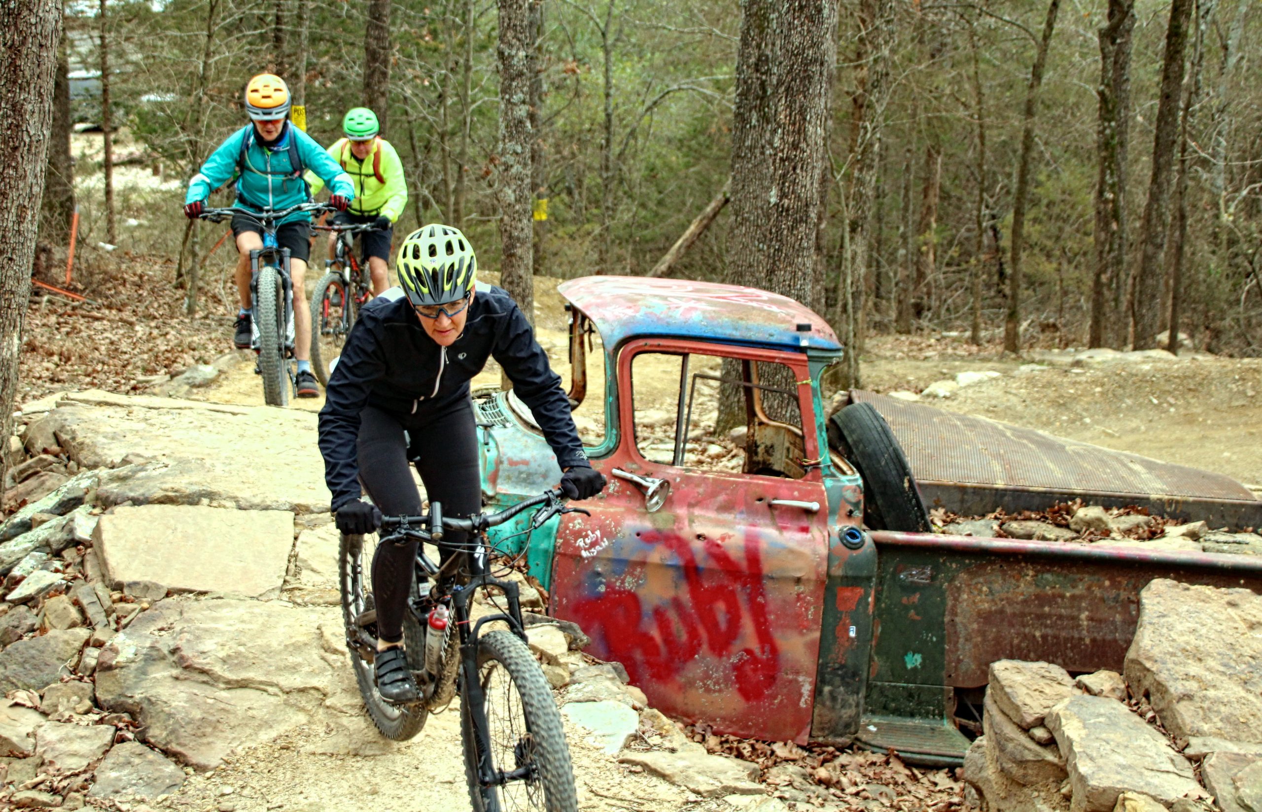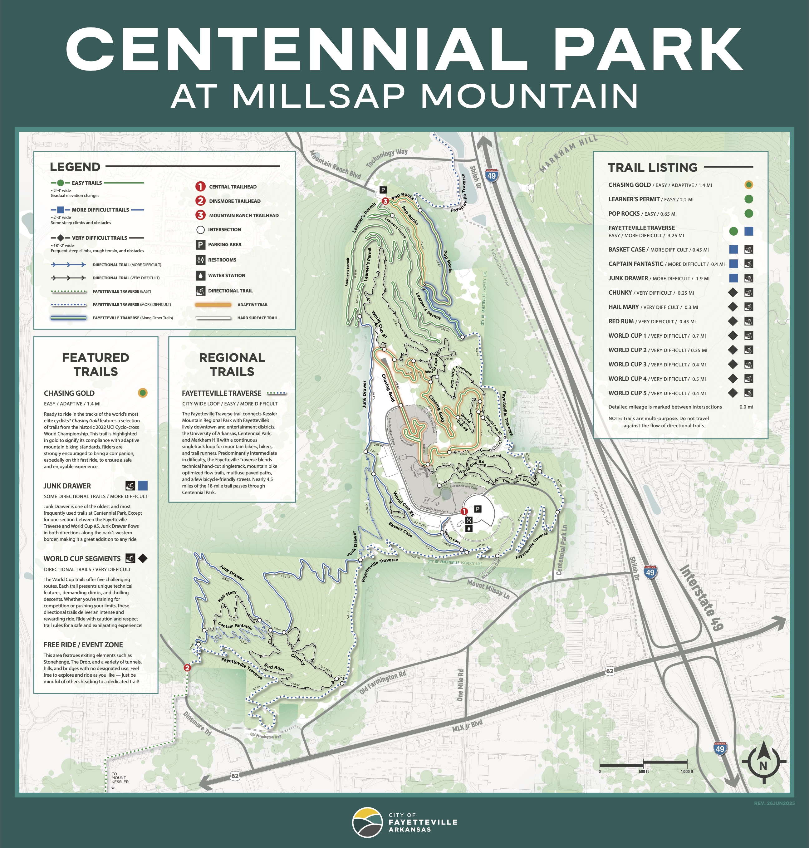 This is where you’ll also find a trail called the Fayetteville Traverse. Once complete, the trail will connect Fayetteville’s amenities, public parks, trail systems, the University of Arkansas, and downtown with a continuous natural surface route. In the meantime, you can use the traverse as part of the return route to the top of four intermediate and expert downhill-only trails with names like Captain Fantastic and Chunky. Expect lots of rocks, multiple line choices, and some of the biggest jumps in the region. The Centennial Park trailhead and parking are accessible from a frontage road along I-49 at the intersection of Mountain Ranch Boulevard and Technology Way.